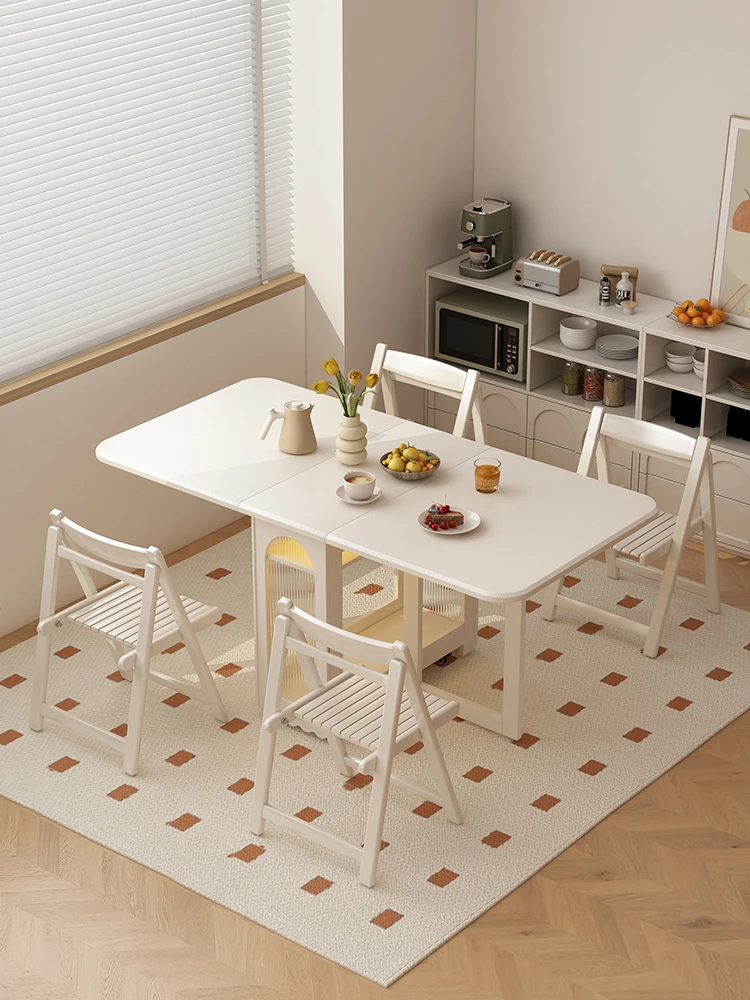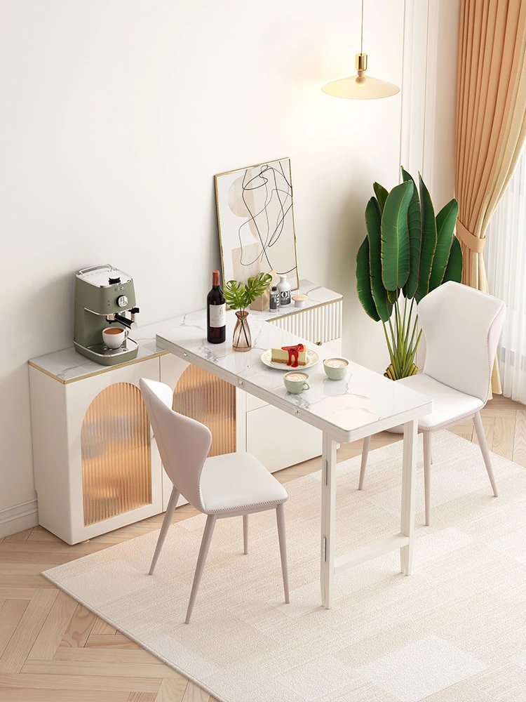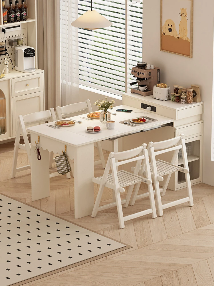 軽フレンチクリーム風オシャレ折りたたみダイニングテーブル&サイドボード一体型!小スペースにぴったり、拡張機能付きホームアイランドテーブルセット