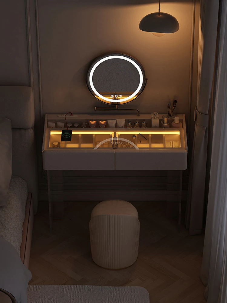 【魅力家居】多功能家庭用ベッドサイドテーブル - 強化ガラス天板付き!小型で使いやすい寝室用デスク、エレガントなクリームスタイルのドレッサーと収納キャビネット