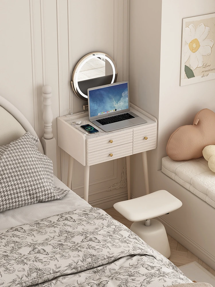 クリームカラーの多機能サイドテーブル:引き出し収納付きミニドレッサー&小型PCデスク、ベッドサイドにぴったり!コンパクトなスペースで卓越した収納力を求めるあなたに最適!
