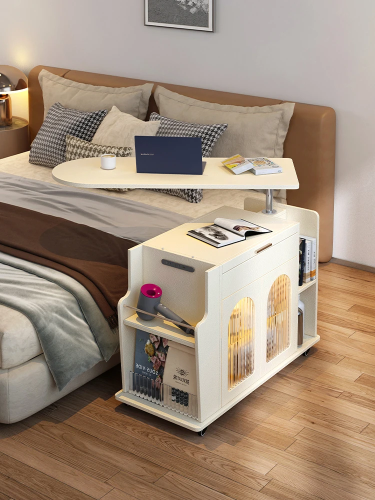 フランス風クリーム色!可動式昇降ベッドサイドテーブルキャビネット、多機能で寝室にぴったりのサイドテーブル&回転式コーヒーテーブル
