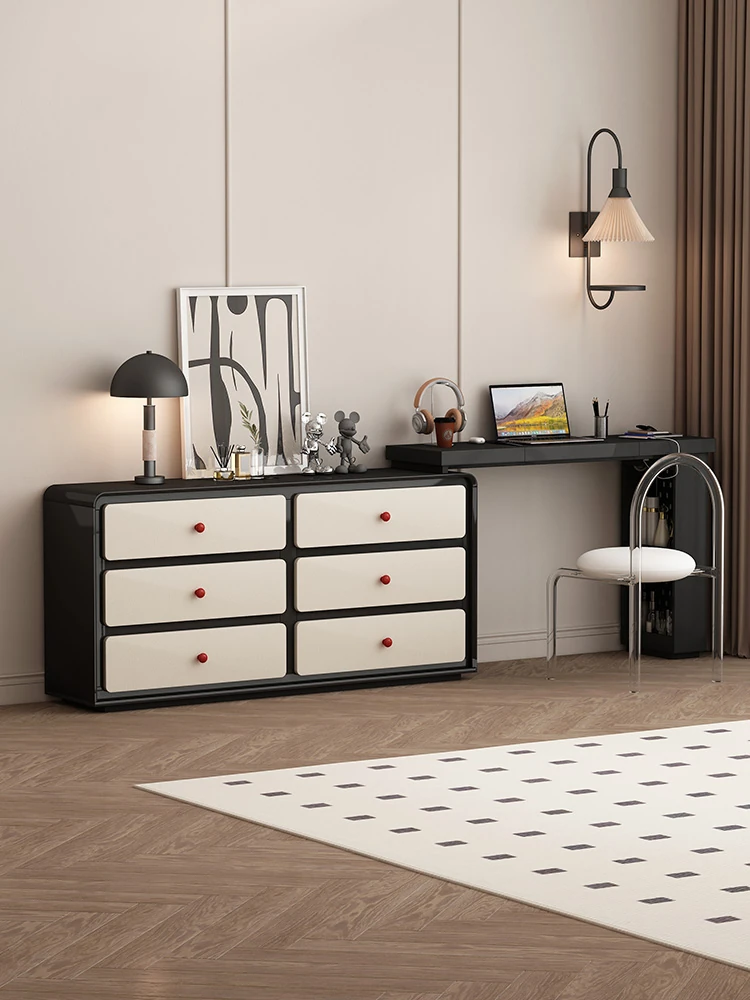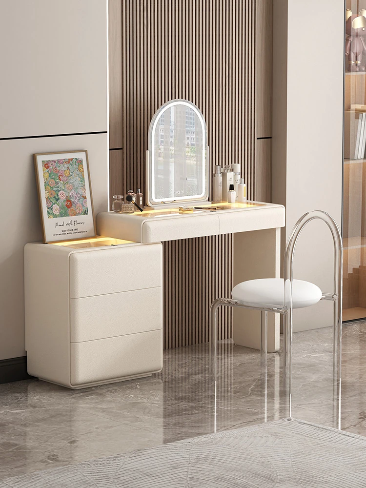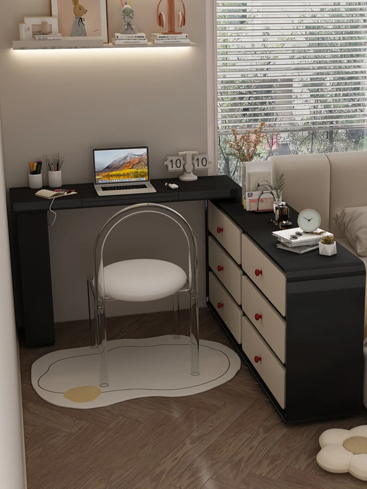 イタリアンミニマルデザイン!多機能ベッドエンドデスク:収納キャビネットとチェスト統合型、フリップトップ型ドレッサー、伸縮可能なモダンオフィスデスク