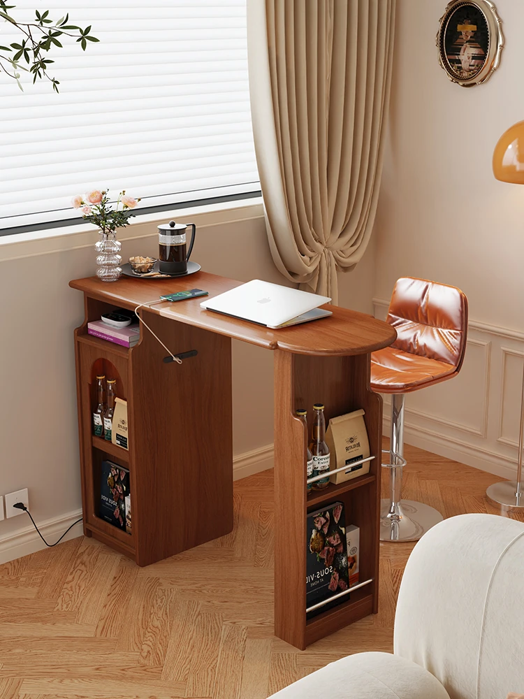 フレンチスタイル全木製スリム回転アイランドテーブル!岩板一体型で、小型住宅にもぴったりの多機能キッチンバー。伸縮可能で省スペース、軽やかなラグジュアリー感を演出します。