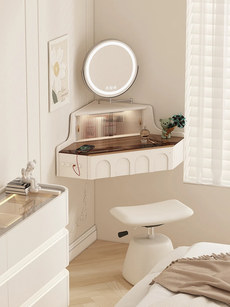 Creamy Dream Girl's Corner Concealed Bedroom Vanity - Perfect for Stylish and Space-Saving Beauty Routines