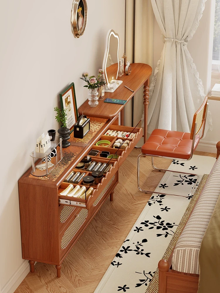 Vintage Rattan Vanity Table with Flip-Top Mirror & Storage Cabinet - Stylish Retro Design for Elegant Home Decor