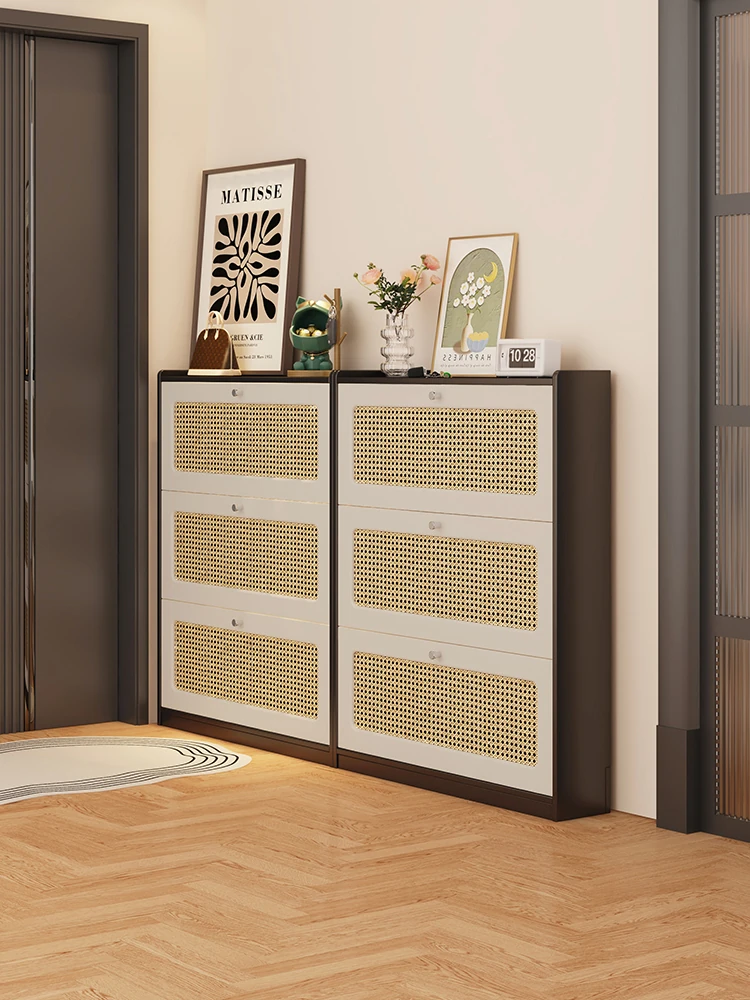 Vintage Solid Wood & Woven Rattan Shoe Cabinet - Spacious Multi-Layer Design, Extra Deep 35cm for Entryway - Perfect for Home Use!
