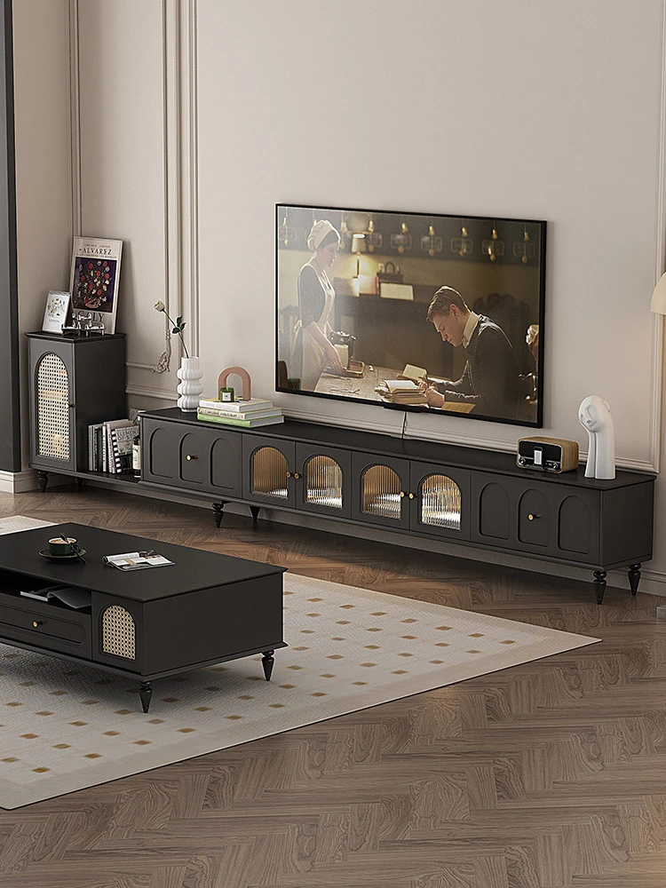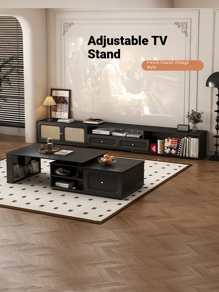 Vintage Black Solid Wood TV Cabinet with Extendable Rattan Design - Perfect for Stylish Living Rooms