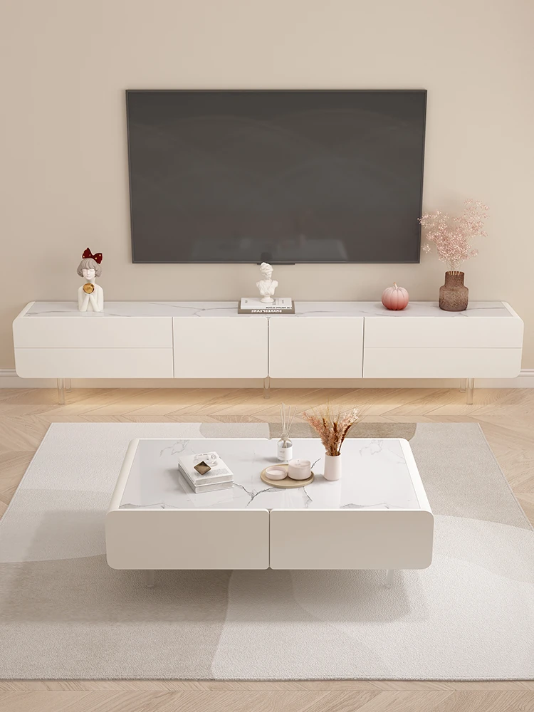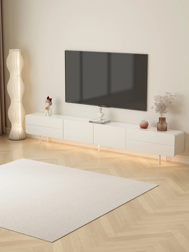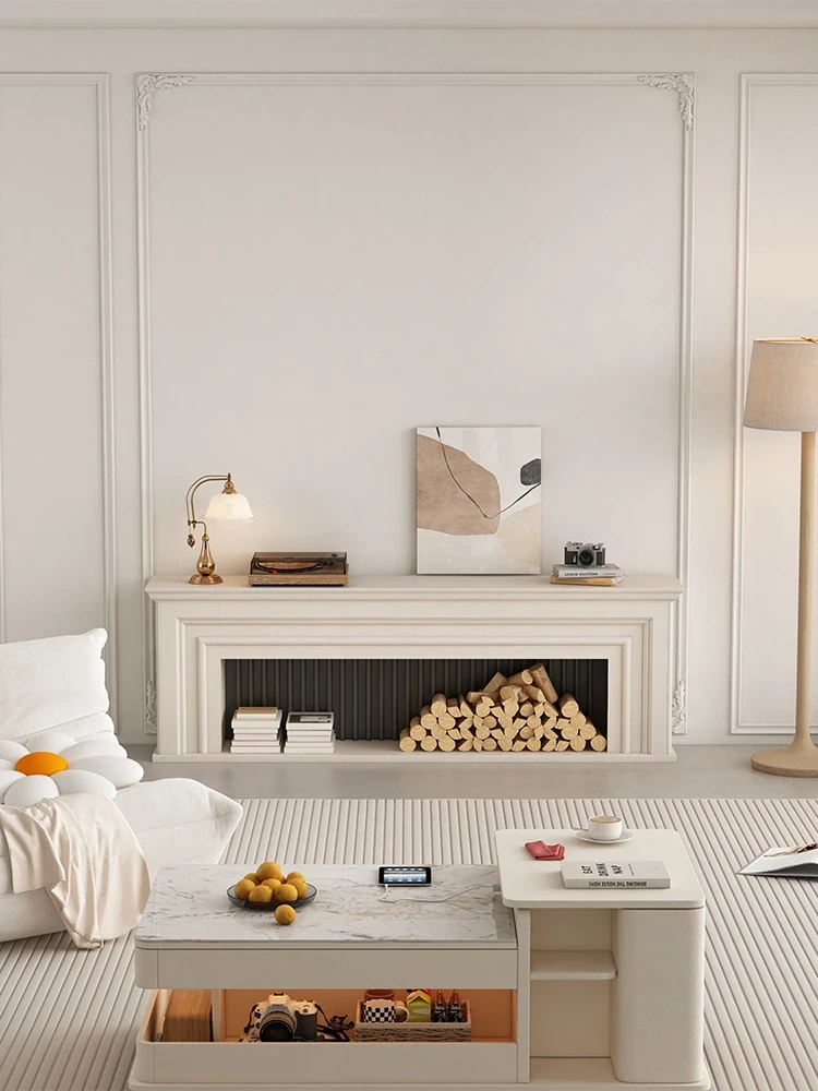 French Style 30cm Ultra-Slim Floating TV Cabinet & Coffee Table for Cozy Living Rooms - Creamy Wall-Mounted Design with Hidden Outlet Cover