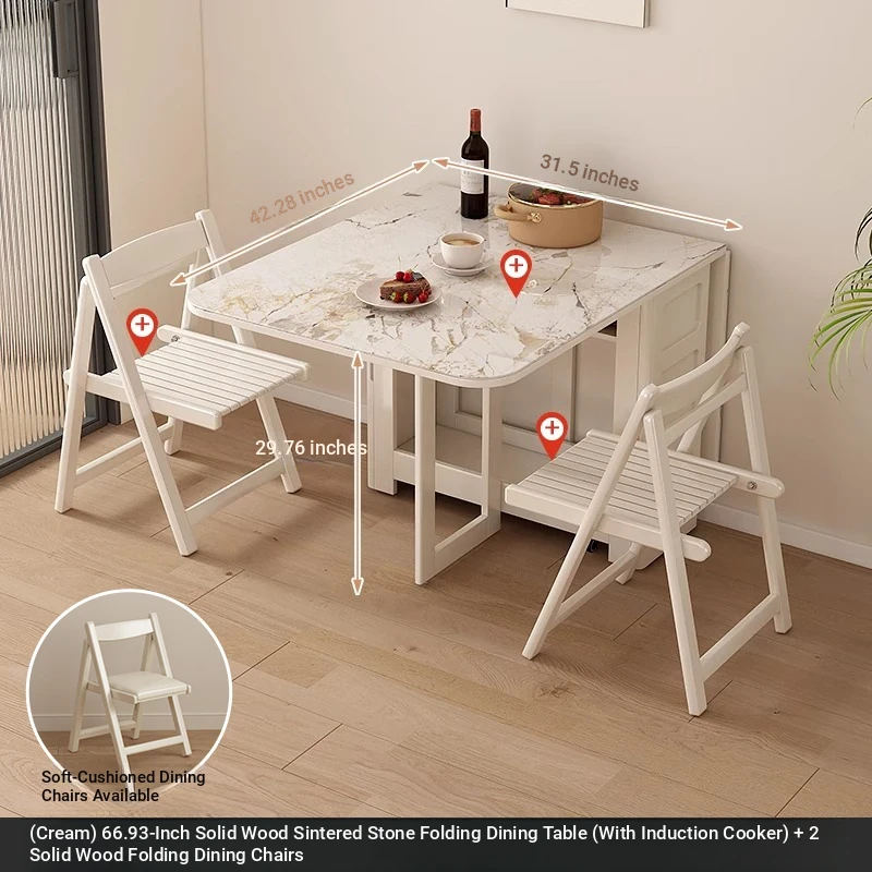 66.93 in solid wood rock board Foldable dining table [cream] + Induction cooker + solid wood Foldable dining chair * 2