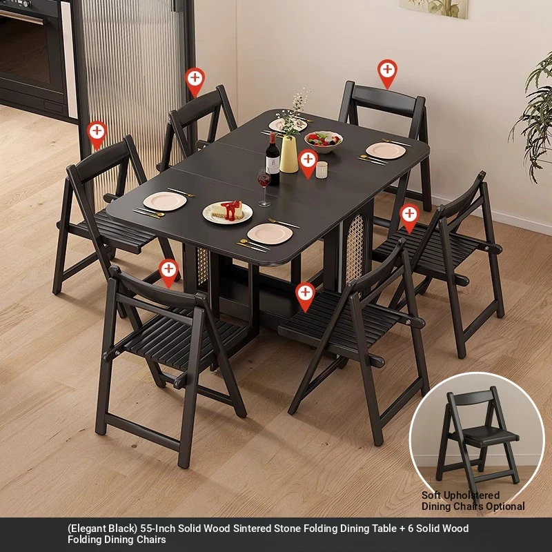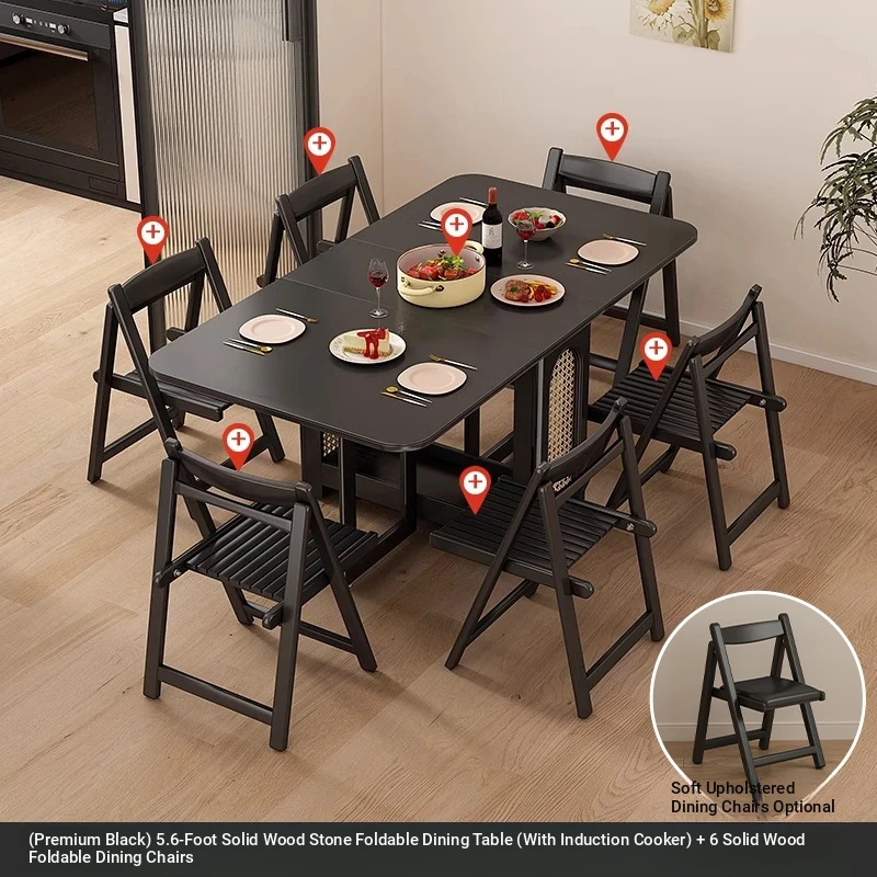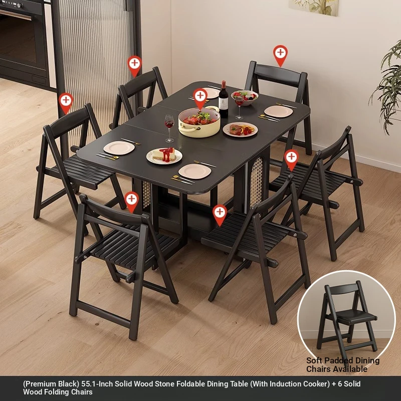 55.12 in solid wood rock plate Foldable dining table [Classy Black] + Induction cooker + solid wood Foldable dining chair * 6