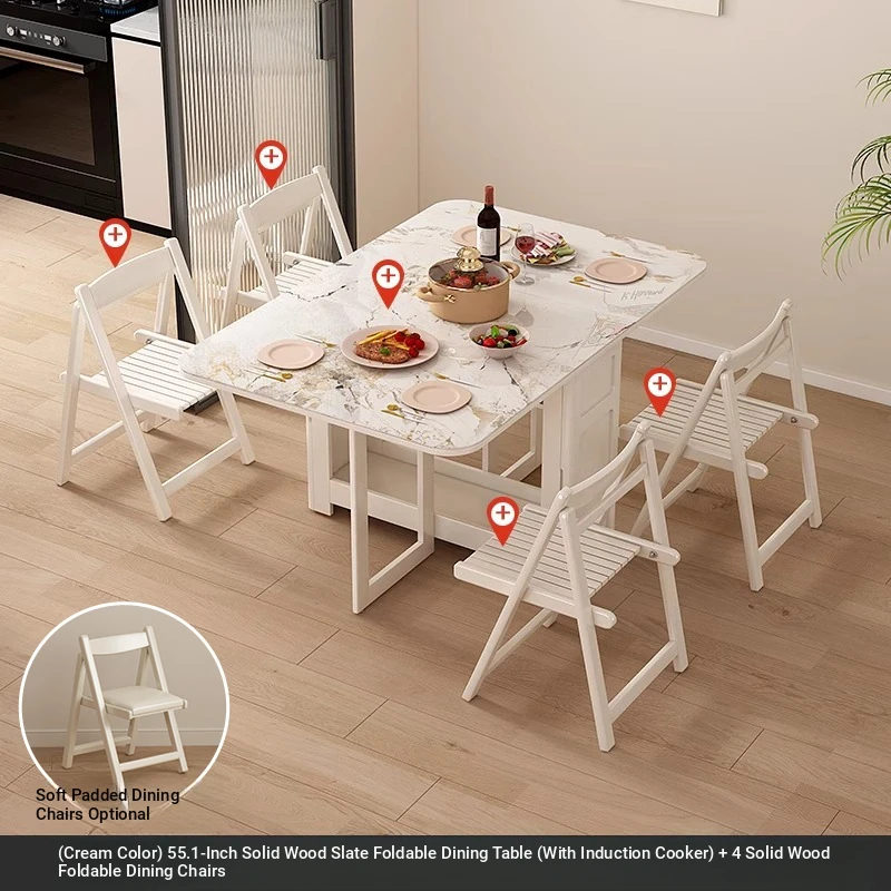 55.12 in solid wood rock board Foldable dining table [cream] + Induction cooker + solid wood Foldable dining chair * 4